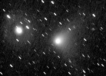 This is a CCD image of comet 1993a Mueller, taken on October 6, 1993 with a 288mm f/5.2 Schmidt-Cassegrain telescope. The comet has a coma diameter of 3' and a fan-shaped tail, up to 7' long. (Courtesy Erich Meyer and Herbert Raab, Austria)